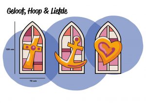 “Geloof, Hoop en Liefde” op zijn eigen wijze in een ontwerp verwerkt.